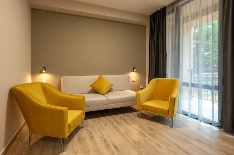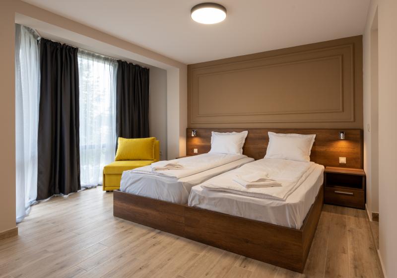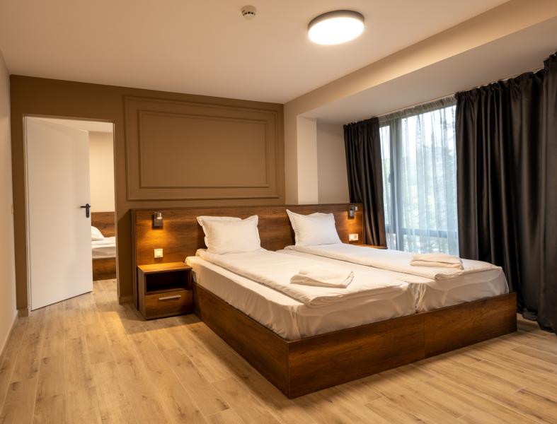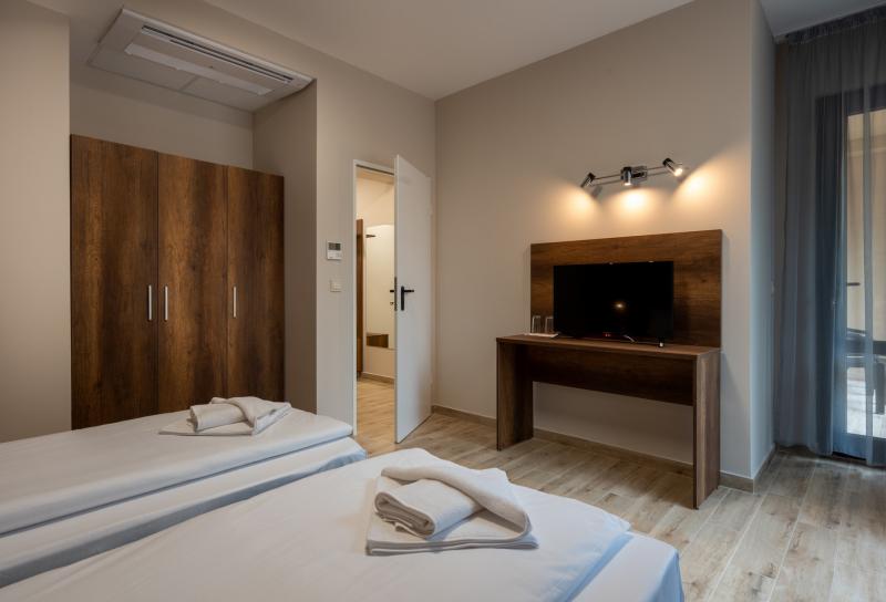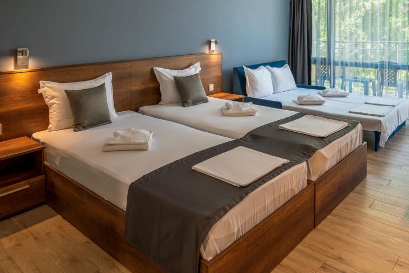 Dvoulůžkové pokoje s možností jedné nebo dvou přistýlek (přistýlka je formou jednoho rozkládacího křesla nebo gauče, který je vhodný pro 2 menší děti nebo jedno větší dítě nebo jednoho dospělého. Dále jsou k dispozicí apartmány (ložníce + obývák, max. obsazenost 2+2 nebo 3+1), rodinné pokoje 1/4 (2 místnosti propojené dveřmi) pro 4 osoby vč. koupelny s toaletou, fén, SAT/TV, Wi-Fi, telefon, centrální klimatizace, lednice, balkon nebo terasa.